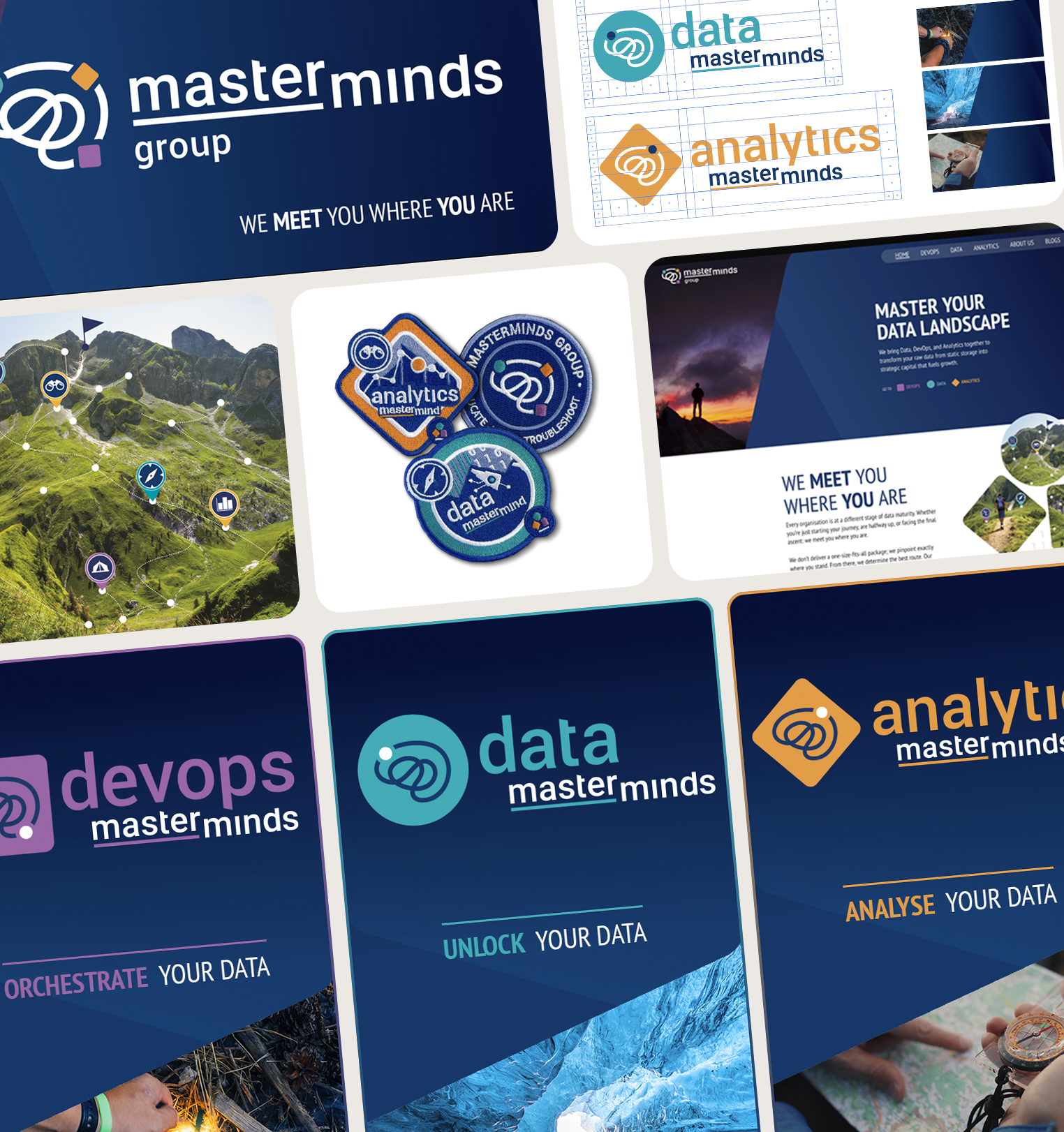 Ons advies voor de nieuwe brand architecture: Breng de drie domeinen onder in een groep. En de Masterminds Group was born. Head of design Jasper deed zijn magic en ontwierp een nieuw logo dat het ‘meesterbrein’ van een andere kant liet zien. Het slimme lijnenspel vormt de hersenen én visualiseert de merkbelofte: ‘We meet you where you are’. Het verhult letterlijk het pad dat klanten afleggen naar hun data-goals.
